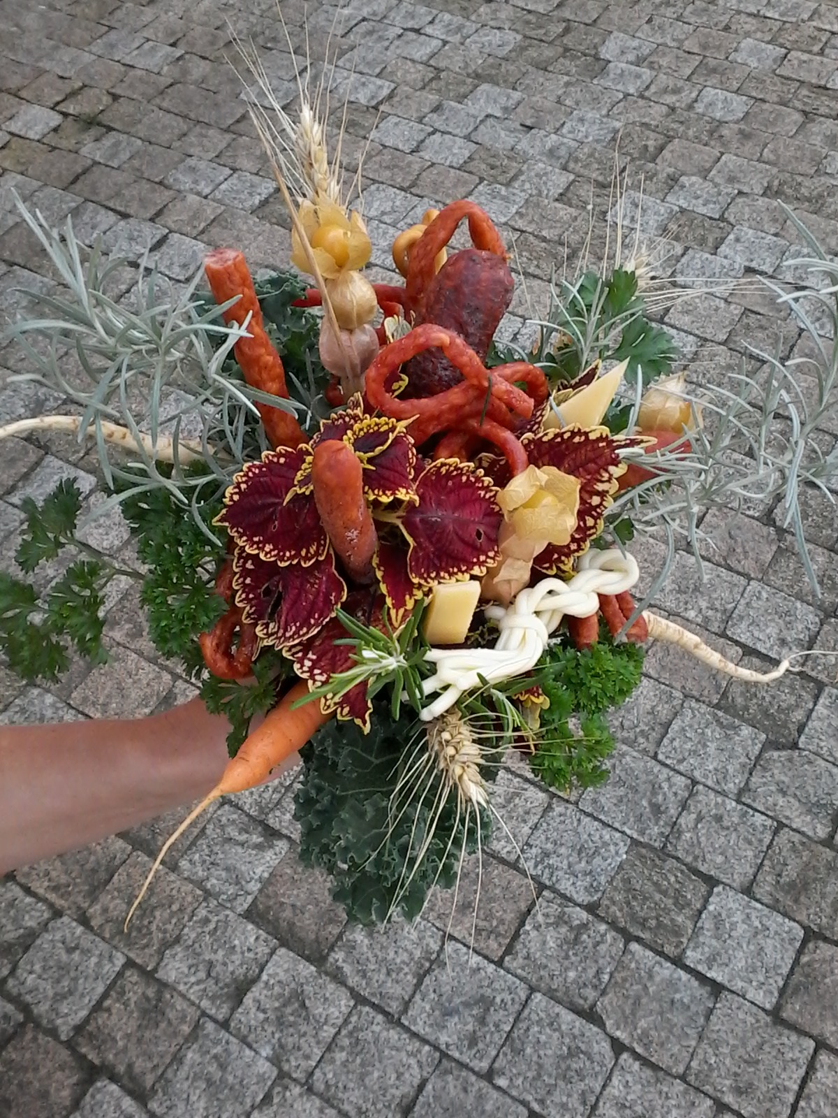 Květiny pro labužníky. Připravíme Vám dle přání klobásovou kytici, kytici z čajů, z ovoce, ze sýrů. Z čehokoli si přejete.